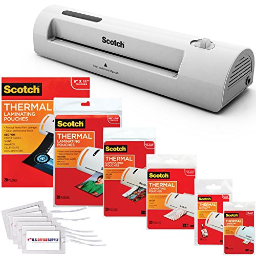 Scotch(TM) Thermal Laminator protects documents you handle frequently. This thermal laminator that will laminate items up to 9 Inches wide. It is a 2 roller system that has two temperature settings. It is photo quality and will laminate up to 5 mil thickness pouches. This is a thermal laminator combo pack. The package contains one laminator that will laminate items up to 9 Inches wide, plus 20 ea high quality thermal laminating pouches. The 20 ea TP3854 pouches can hold sheets up to 8.5 x 11 Inches.Feature