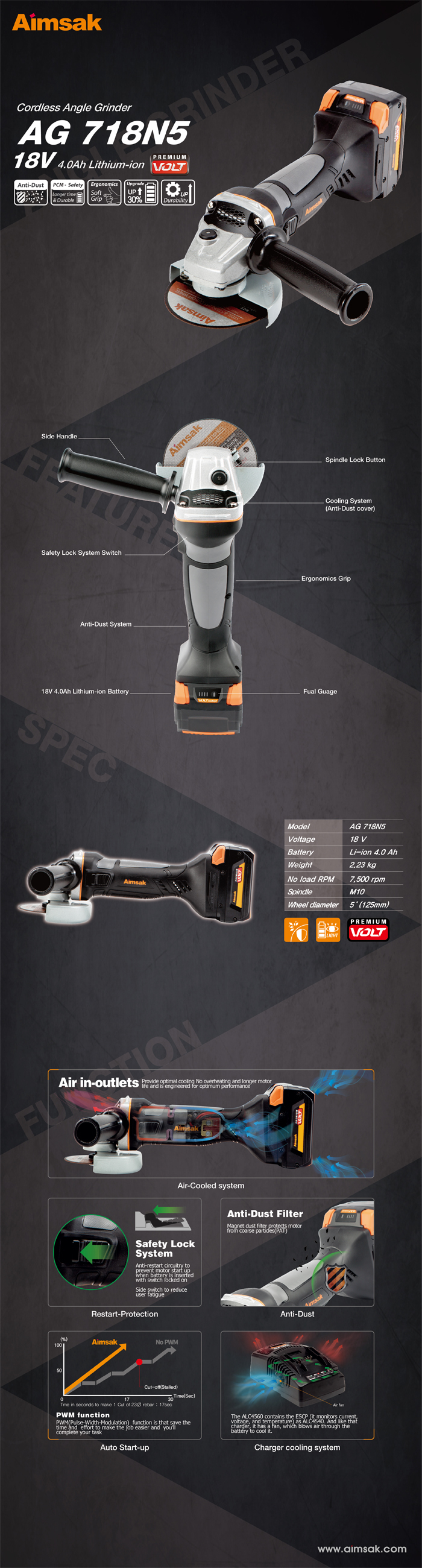 Aimsak Coldless Angle Grinders AG 718N,grinding charge, Premium VOLT battery 18V 4.0Ah Lithium-ion & Simple English Manual
