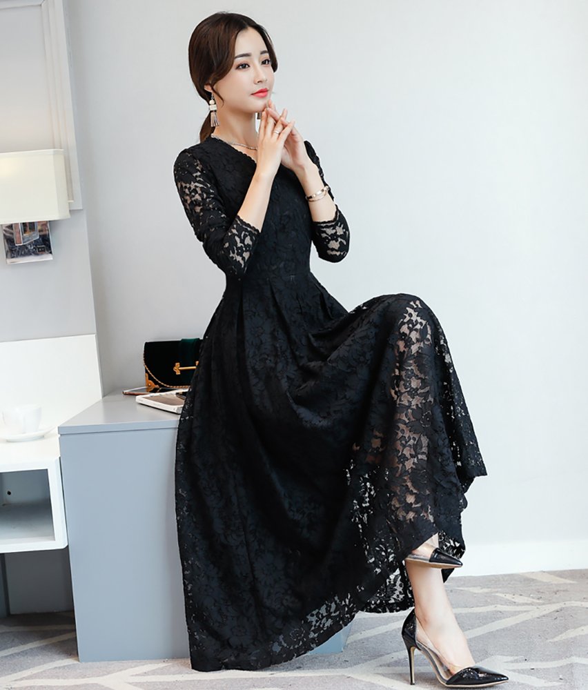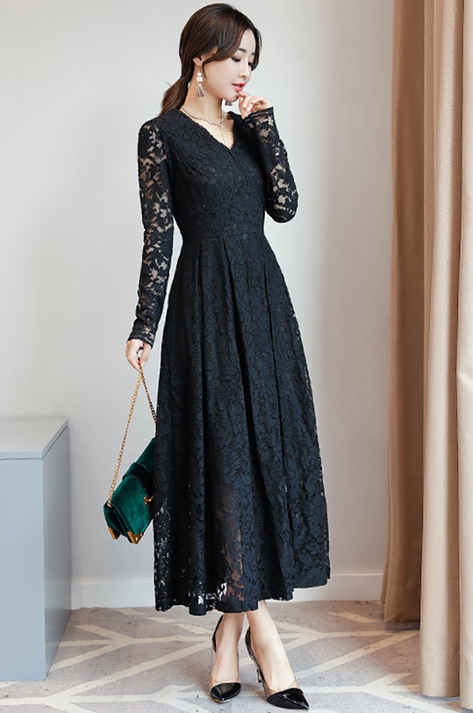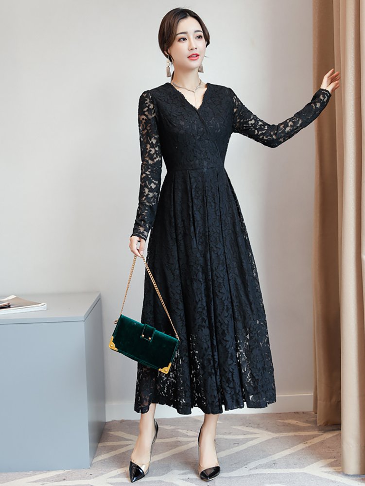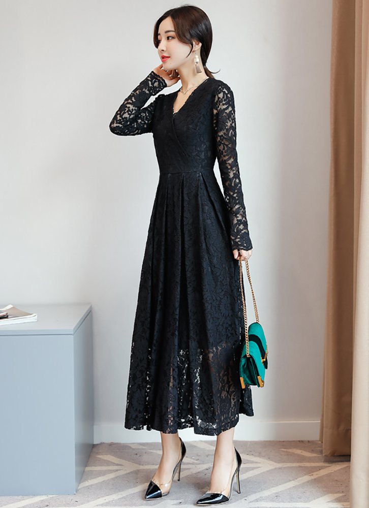 Feminine dress one piece lace V neck long length elegant wedding party ladies clean linen tunic long sleeve thin
