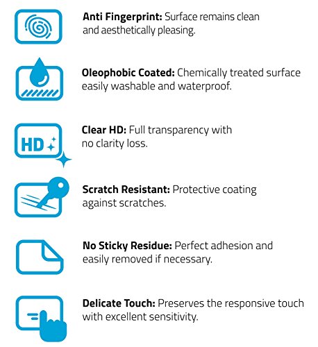 - Feature : Anti Fingerprint: surface remains clean and aesthetically pleasing / Clear HD: Full transparency with no clarity loss / Oleophobic Coated: Chemically treated surface easily washable and waterproof / Scratch Resistant: Protective coating against scratches / Delicate Touch: Preserves the responsive touch with excellent sensitivity / No Sticky Residue: Perfect adhesion and easily removed if necessary