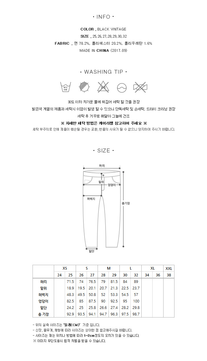| 되도록 드라이 크리닝 하십시오. 손세탁시 뒤집어 단독세탁 하십시오. 착장시 가방류나 밝은 색상의 의류에 이염 될 수 있으니 주의 하십시오. 반드시 단독 손세탁 또는 드라이 하십시오. 세탁시 탈색의 우려가 있으므로 단독 세탁하십시오. 품질 경영 촉진법에 의한 품질 표시를 꼭 참조하시어 세탁하십시오. 합성세제 세탁시 손상 및 탈색의 우려가 있으므로 미지근한 물에 중성세제로 세탁하십시오. 절대 염소계 표백제로 표백할 수 없습니다. 땀에 젖었을 경우 즉시 세탁하십시오. 심하게 비비거나 비틀어 짜지 마십시오. 물에 10분이상 담가두지 마십시오. 취급부주의로 인한 탈색 및 오염 등 제품의 형태 변질 및 수축된 제품은 보상이 불가능 하오니 주의 하십시요. 취급표시대로 세탁하지 않을시에는 보상받으실수 없습니다. |