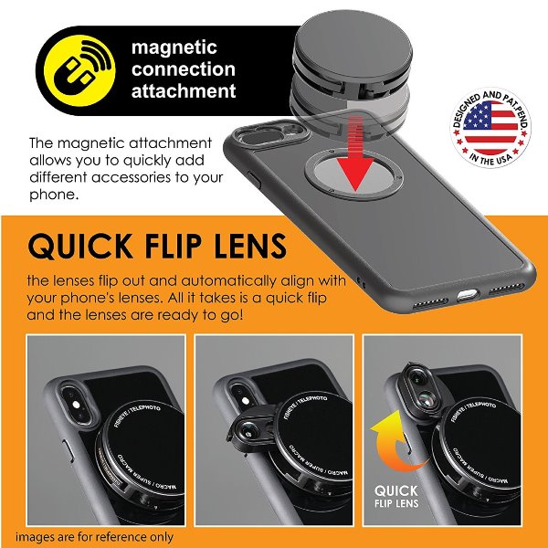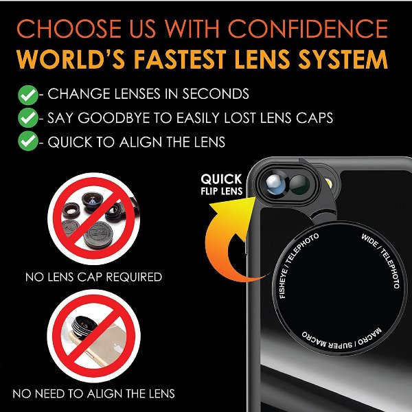 • READY IN SECONDS: With our QuickFlip technology, the lenses flip out and automatically align with your phone’s lenses. Never worry about missing the moment, since you can attach and change lenses in seconds.