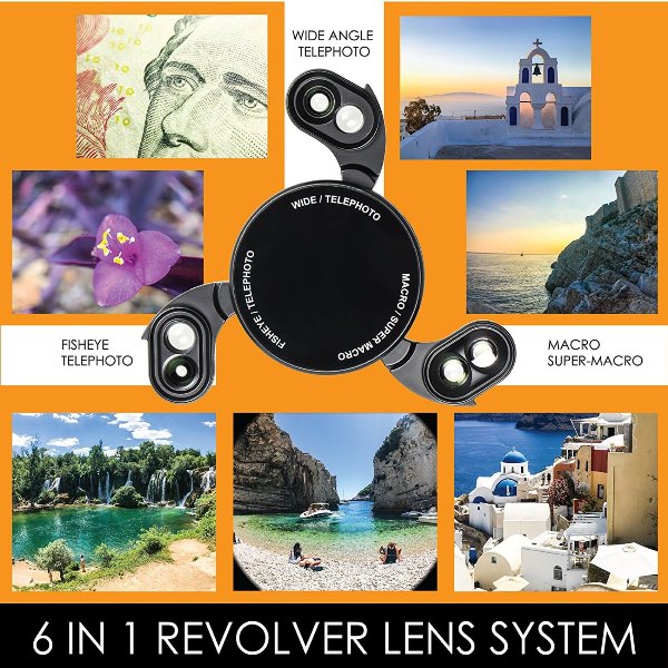 • 6-IN-1 REVOLVER LENS: The Ztylus 6 in 1 Revolver Lens Attachment comes outfitted with 3 sets of lens options: Wide Angle/Telephoto, Macro/Super Macro, Fisheye/Telephoto.
