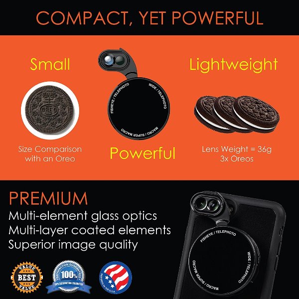 • DUAL LENS SOLUTIONS: The patented 6-in-1 Lens Kit offers an extremely compact size that is full of functionality. The dual optics design is fully compatible with your phone’s dual lens camera.