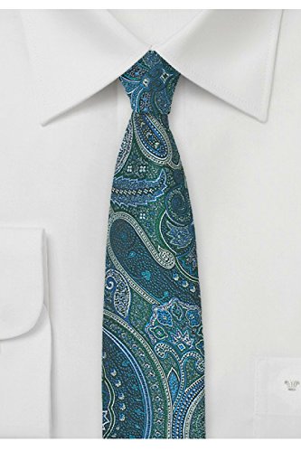 Binding : Apparel Product Description Show off your mesmerizing style with this Skinny Paisley Tie In Teal and Aqua. A striking menswear accessory with its bold color palette of blues and greens. This item looks best with a solid dress shirt and a dark jacket in black, navy, or grey. The lively paisley design is woven, not printed, into the fabric using a jaquard loom. Made from a wrinkle resistant microfiber that has the look and feel of silk. 0