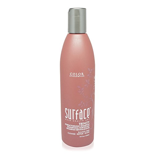 -. Binding : Misc. -. Brand : SURFACE -. EAN : 0887140504526 -. Feature : Natural cleansing and strength. Natural palm and coconut oils gently cleanse while vegan protein strengthens all hair types. What it does: This shampoo has been perfectly designed to strengthen while natural palm and coconut oil gently cleanse. Hair is left feeling repaired, shiny and with great volume. What else you need to know: Strengthen Repair and Volumize Shine A New World of luxurious 'Velvet' Lather -. IsAdultProduct : 0 -. Label : Surface -. Manufacturer : Surface -. MPN : sur22-10-oz -. NumberOfItems : 1 -. PackageQuantity : 1 -. PartNumber : sur22-10-oz -. ProductGroup : Beauty -. ProductTypeName : BEAUTY -. Publisher : Surface -. Studio : Surface -. Title : Surface Trinity Strengthening Shampoo Color Lock 10oz -. UPC : 885672660352