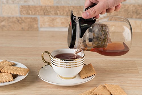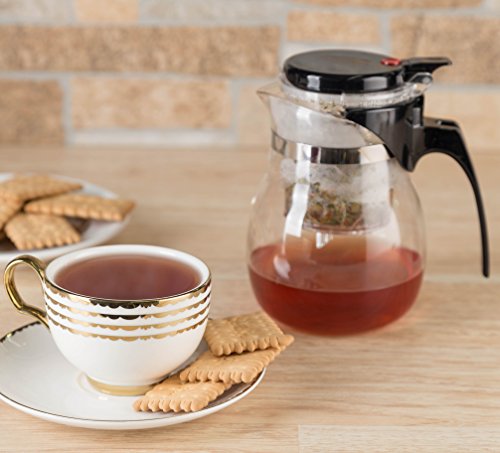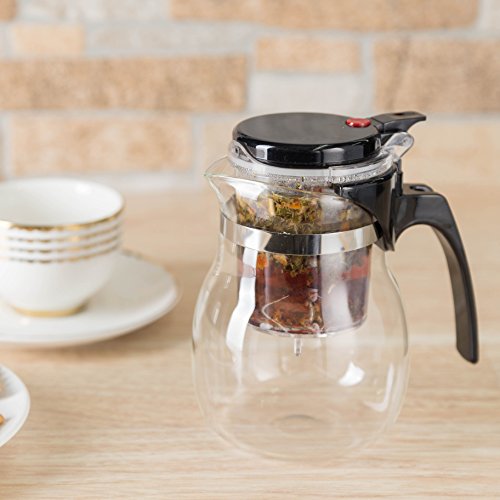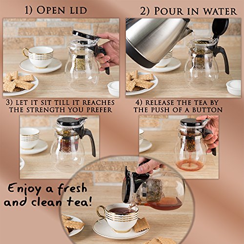 Studio : Kitchen Winners Publisher : Kitchen Winners Product Description Simple to Use 1. Place tea inside top compartment 2. Fill infuser with hot water 3. Steep tea to desired taste 4. Press red button on top to release brewed tea into bottom chamber 5. Repeat steps and change tea as needed Cleaning Instructions Simply twist the top chamber (infuser) to the left to unlock and pull up to remove. Remove the filter from infuser to remove tea leaves. Rinse all parts with warm water and soap. 0