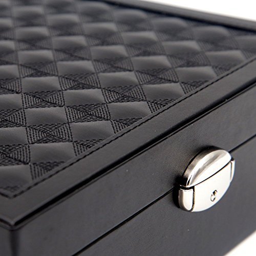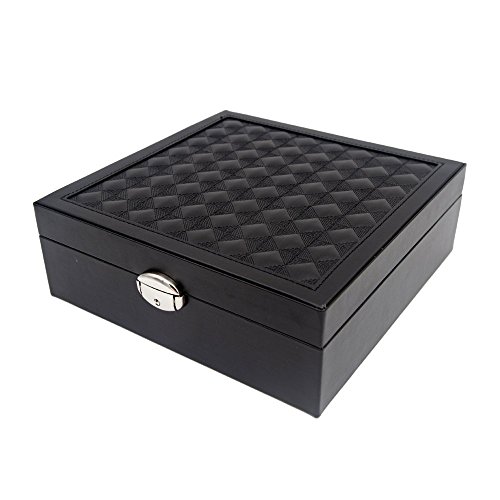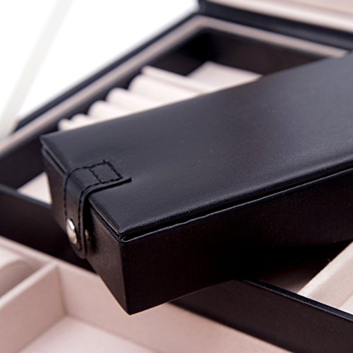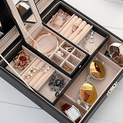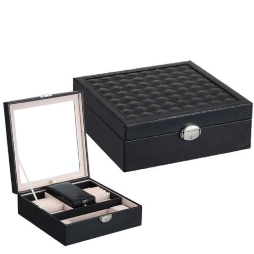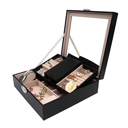 LARGE CAPACITY DIVERSIFIED STRUCTURES - 10" x 10" x 2",plus smaller 6" x 3" x 1 1/4" removable box, bottom has several separators for bigger things, 3 removable layers provide plenty of compartments to hold your jewelry from earrings to large bulky necklaces,2 cushiony watch holders keep your watches in order.