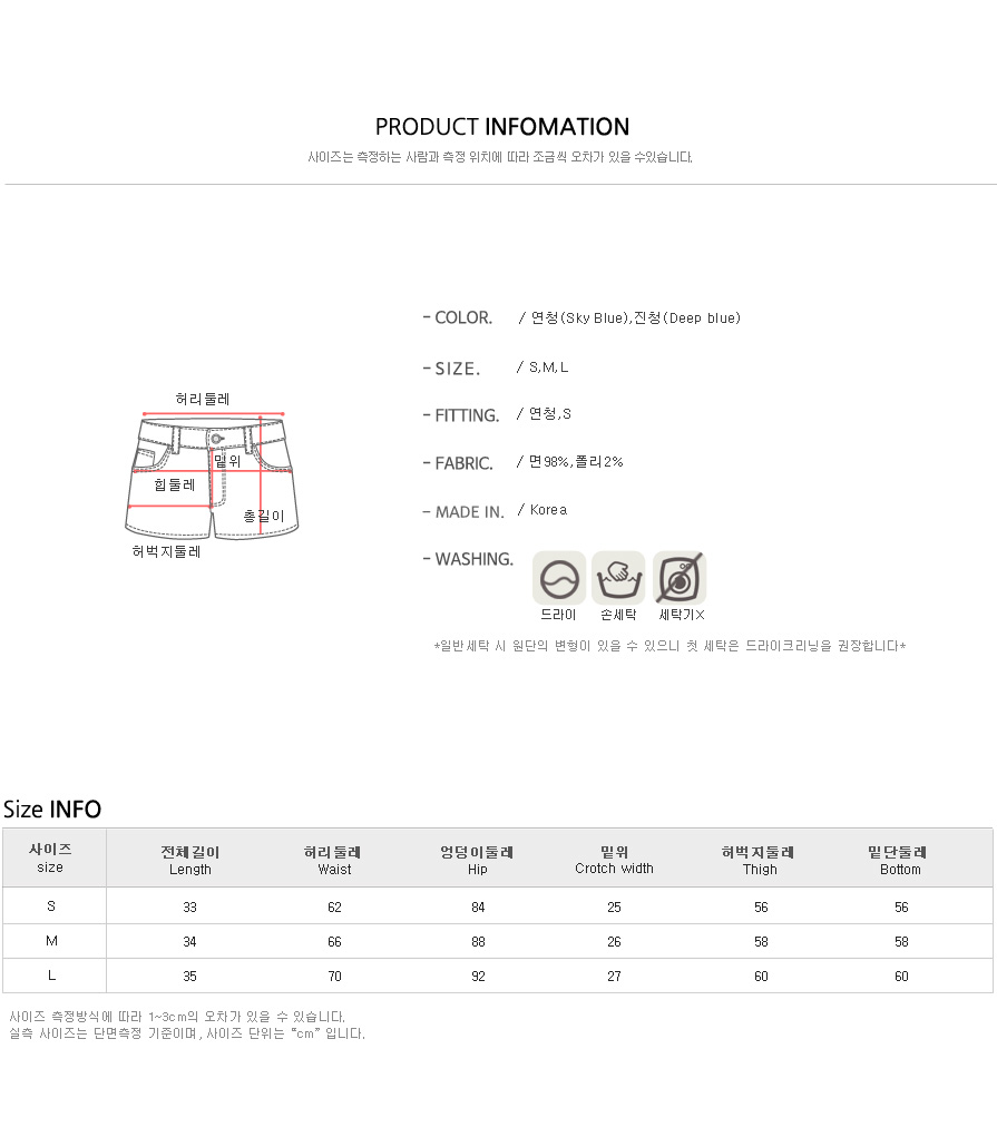 컬러는 연청,진청 2컬러에 S,M,L 사이즈 준비했어요