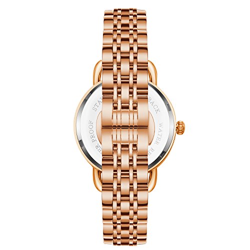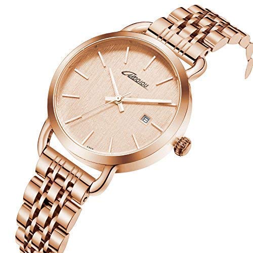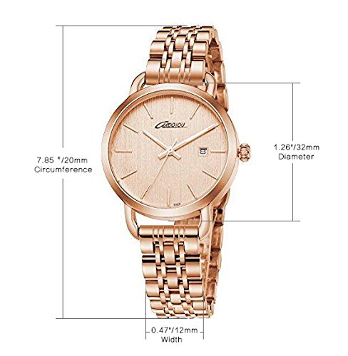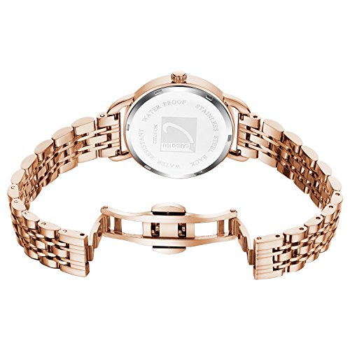 Brand, Seller, or Collection Name:Cardqiou Part Number:PL-OATG-2TWM Item Shape:Round Display Type:Analog Clasp:Fold-Over Clasp with Double Push-Button Safety Case material:Metal Case diameter:1.26 inches Case Thickness:0.24 inches Band Material:Stainless steel Band length:Women's Standard Band width:0.60 inches Band Color:rose gold Dial color:rose gold Bezel material:Metal Bezel function:Stationary Calendar:Date Special features:World time Movement:Japanese quartz Water resistant depth:99 Feet