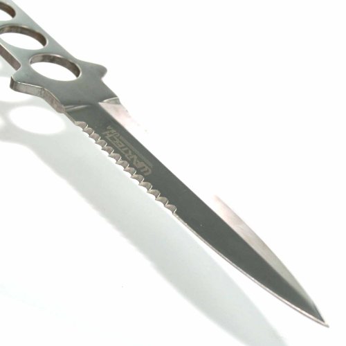 Features one solid piece of 420 stainless steel with razor back serrations. The impact resistant sheath attaches to your ankle for superb diving action. A high performance dive knife built for superb action.