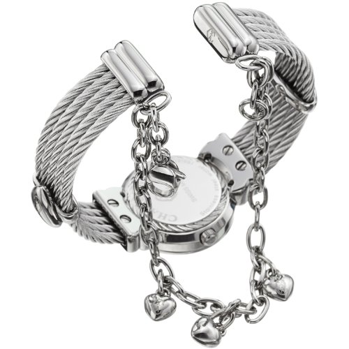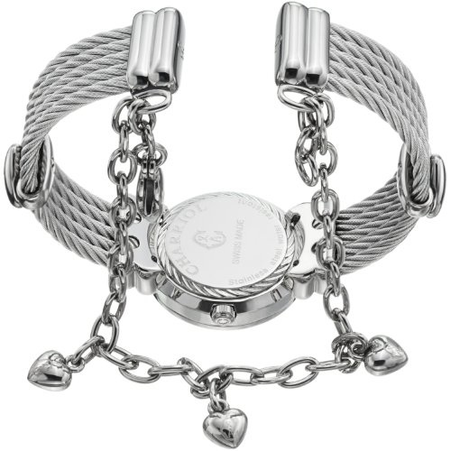Polished stainless steel case and bracelet (chevron cable), Stainless steel caseback (screw-in), Bezel engraved with "Charriol"