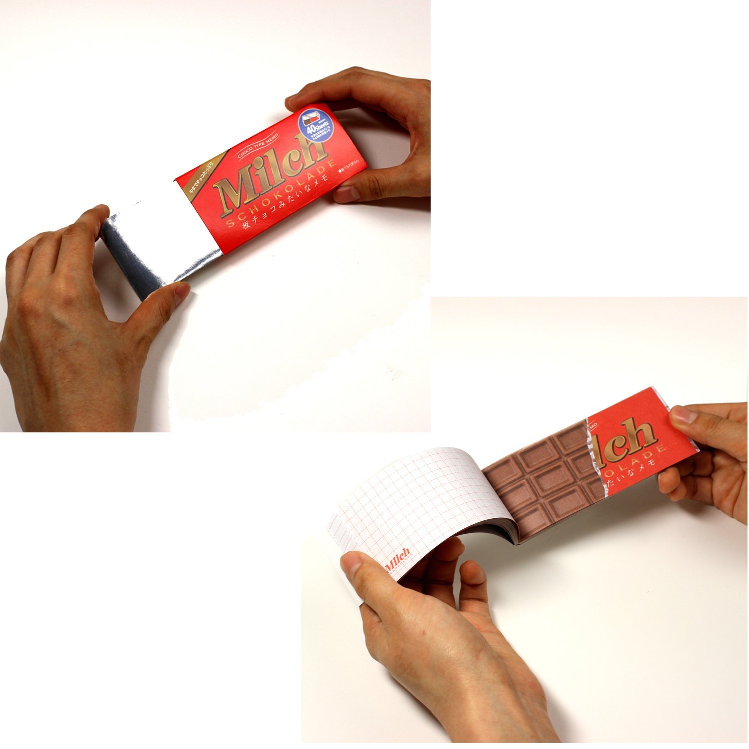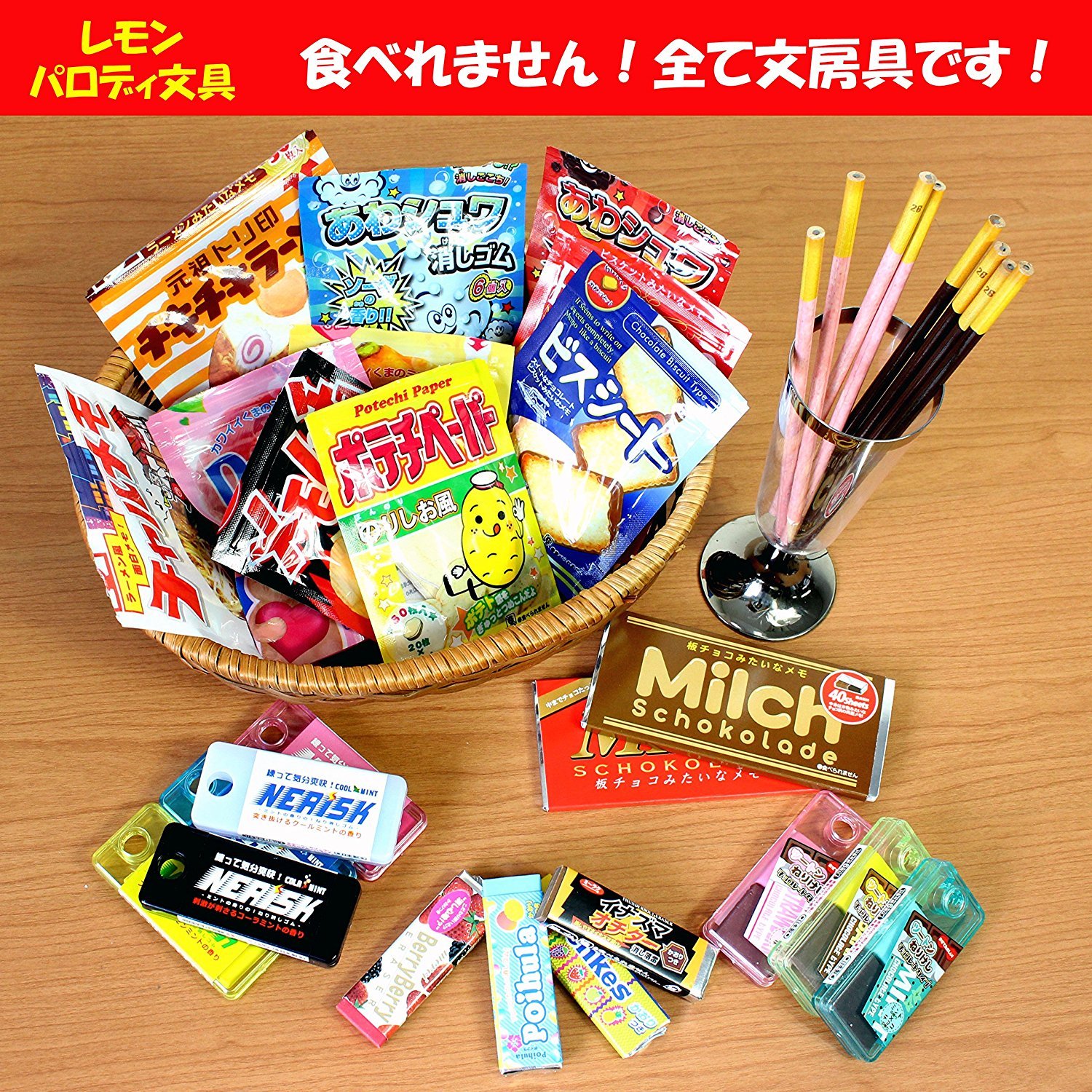 In the parody stationery series, notes like chocolate boards, erasers like gums, memos like ramen,