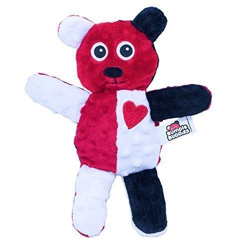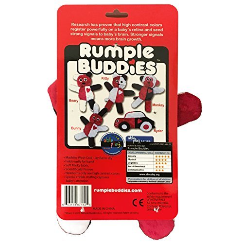 Great for babies and older children, this Rumple Buddies Beary Rumples features a textured and embroidered soft plush bear that is proven to stimulate and encourage brain activity with its high contrast colors, texture and crinkle stuffing. Rumple Buddies are doctor recommended! They stimulate 3 senses: hearing - calming crinkle, touch - textured fabric and visual - high contrast colors (red, white & black). Research has proven that high contrast colors register powerfully on a baby's retina and send strong signal to baby's brain. Stronger signals mean more brain growth. Special crinkle stuffing captures baby's attention. Bear is machine washable and folds easily for travel. Includes a small storybook.Feature
