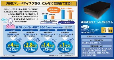 ?「アクオス」などの外付けハードディスク用のUSB端子を搭載したテレビと接続することで、地上デジタル放送がテレビのリモコンひとつでを気軽に録画できます。