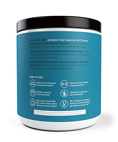 CONVENIENT, 100% PURE MCT OIL POWDER - Perfect supplement for those who want the benefits of liquid MCT oil WITHOUT the mess, digestive distress or travel headache. Perfect Keto's MCT Oil Powder is creamy, smooth and adds creamy texture, delicious taste and healthy fats to your coffee or smoothies.