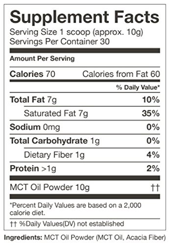 Each tub contains 12oz of 100% pure Powdered MCT Oil, good for 30 full-scoop servings, or 60 half-scoop servings.