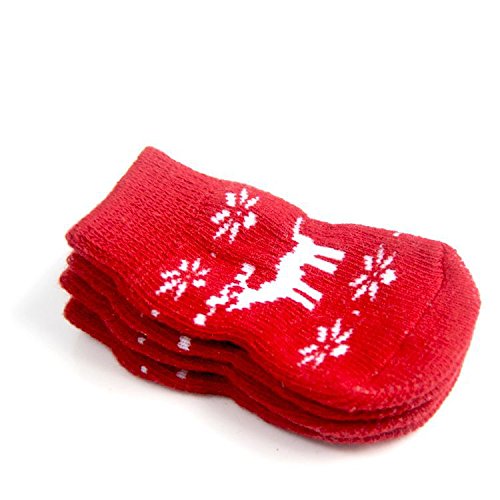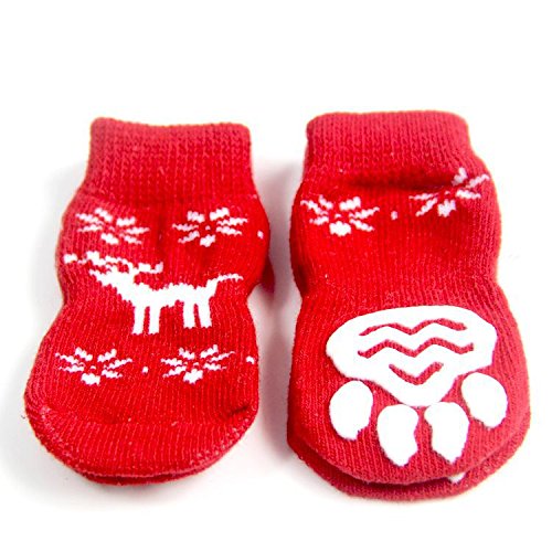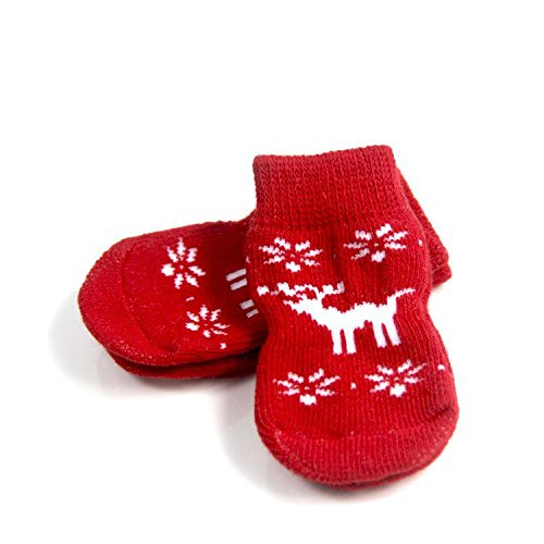-. Feature : Cute snowflake deer patterned socks, both protect the dog's paws and prevent it from scratching the furniture and floor. / Size S: approx. sock width--1.1"/3cm; sock length--2.3"/6cm. Each pack contains 4 socks. / Anti-Slip rubber gel print on the socks bottom to provide extra traction on slippery surfaces. / Material: made of high quality cotton fabric, good elasticity, soft and warm. / Ideal for small medium sized pet dogs and cats, keep your pet's paws nice and warm.