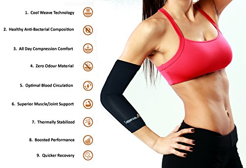 MUSCLE AND JOINT SUPPORT: These elbow sleeves are constructed of the highest quality standards. They are made from copper infused fabric which maximizes recovery and healing, while also offering adequate muscle and joint support.