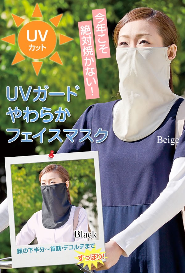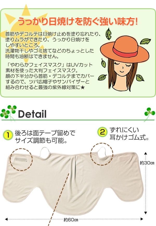 | 今年こそ「うっかり日焼け」を阻止しよっ★「やわらかフェイスマスク」はUVカット素材を使った大判フェイスマスク。顔の下半分から首筋・デコルテまでカバーするので、ツバ広帽子やサンバイザーと組み合わせると最強の紫外線対策に★ |