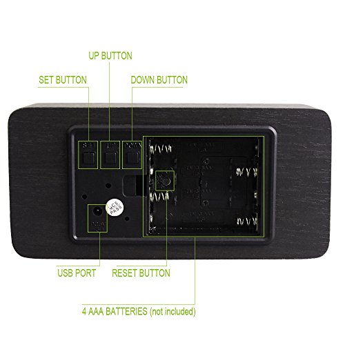 If LED display keeps ON and only powered by batteries, battery is easy to waste (Works around 3 days). Please use the USB cable replaces the batteries to charge your clock. Please use the clock in dry area,due to all wooden housing. You May Need to Press the Reset Button to Make it Work at the First time.You Can Find the Reset Button inside the Battery Cover! Packing List: 1 x cube alarm clock 1 x plug cord 1 x User's manual