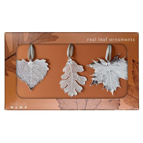 Real Leaf Ornament, Set of 3 Silver Ornaments - Cottonwood, Lacy Oak, and Sugar Maple