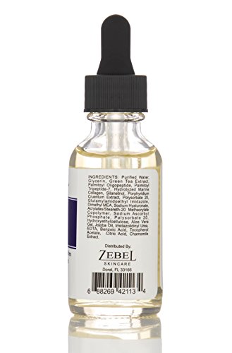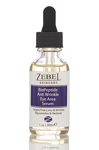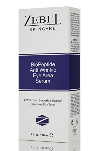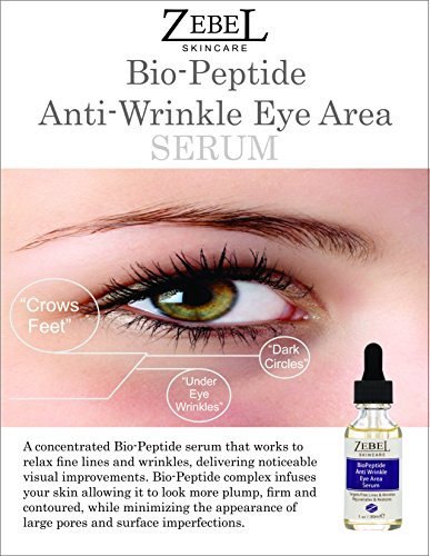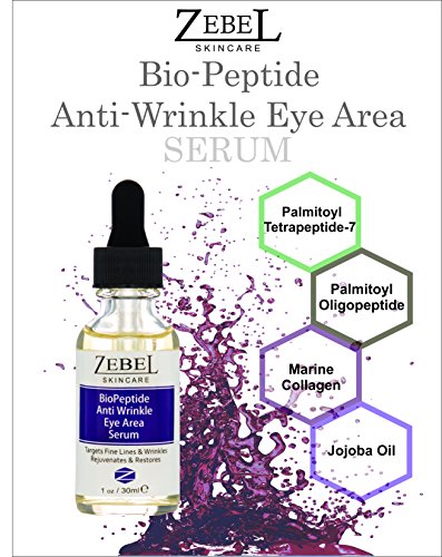 -. Binding : Misc. -. Brand : Zebel Skincare -. EAN : 0688269421134 -. Feature : Works to relax fine lines and wrinkles / Delivers noticeable visual improvements / Infuses your skin allowing it to look more plump, firm and contoured / While minimizing the appearance of large pores and surface imperfections -. IsAdultProduct : 0 -. Label : Zebel Skincare -. Manufacturer : Zebel Skincare -. Model : Zebel-Skincare-Bio-Peptide-Serum -. NumberOfItems : 1 -. ProductGroup : Beauty -. ProductTypeName : BEAUTY -. Publisher : Zebel Skincare -. Studio : Zebel Skincare -. Title : Zebel Skincare - Bio-Peptide Anti-Wrinkle Eye Serum with Aloe Vera and Jojoba oil to on fine lines and wrinkles -. UPC : 688269421134