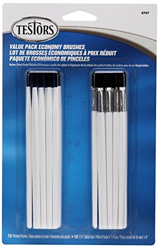 -. Binding : Misc. -. Brand : Testors -. EAN : 0075611870700 -. Feature : Perfect for the painter who wants to try a variety of colors on any project / Includes Pointed Round Brushes for fine detail / Includes 10 Flat Round Brushes for general purpose / Brushes are made with durable plastic handles and synthetic bristles / Great brushes for children, casual modelers and casual crafters -. IsAdultProduct : 0 -. IsAutographed : 0 -. IsMemorabilia : 0 -. Label : Testors Home -. Manufacturer : Testors Home -. Model : 8707 -. MPN : 8707 -. NumberOfItems : 1 -. PackageQuantity : 1 -. PartNumber : 8707 -. ProductGroup : Art and Craft Supply -. ProductTypeName : HOME -. Publisher : Testors Home -. SKU : 238273 -. Studio : Testors Home -. Title : Testors 20-Pack Economy Paint Brushes -. UPC : 885501402580