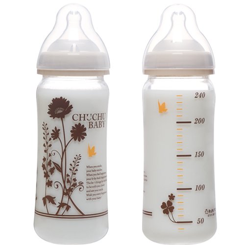 "Natural design from ChuChu Baby Feeding Bottle, The bottles are designed specifically for moms to enjoy fashionable styles. Natural and gentle design resembles plants. It makes moms feel organic. Super Cross Cut Hole Technology:World-wide patents applied. This adaptive structure maintains a suitable hole size that may be used until weaning. The super cross cut hole is usually closed, but only opened by the baby's suction and teething power. It will not leak even if bottle tips over. Because ChuChu Baby's teat resembles mom's breasts, it can make an adjustment of the amount of milk flow controlled by the baby's suction. It is made of transparent and tough Silicone. Anti-Colic:The air vent located on the side of the teat prevents the inside of bottle from becoming a vacuum. Any air adjustments by the cap are unnecessary and this structure dispenses just the right amount of milk sucked by a baby. Wide-Neck:The wide-neck bottle design cleans easily and the wide-neck teat shape is designed to be similar to the mom's breast in order to prevent babies from getting confused when switching between breastfeeding and bottle feeding. Material:Tough heat-resistant glass bottle that does not get dirty easily. OK to sterilize by boiling water, with chemical agents or by microwave. Cap and hood are made of Polypropylene. Safe and secure bottles based on "Made in Japan" quality. "Feature