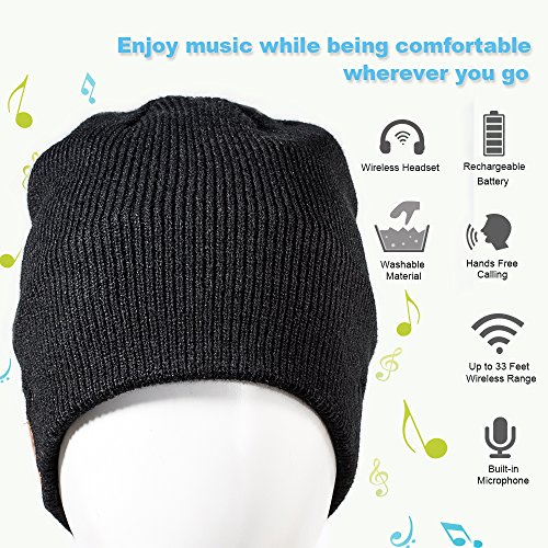 -. Feature : Fashion & Tech Combine: Super soft Acrylic and Polyester trendy knit beanie, keep you head warm while also listening or making calls with hands free via the newest bluetooth technology. / The Newest Bluetooth Technology: Equipped with high efficiency Bluetooth wireless technology, easy and fast to pair with all the Bluetooth enabled media devices, such as smartphone, iPhone, iPad, tablet, Android, MP3, MP4, digital media player and more. Wireless range up to 33 feet. / Ultra-long Talking & Music Time: Built-in rechargeable Li-Ion battery, 6 hours play time, 60 hours standby time with only 1.5 hours charge time, you haven't to concern its battery when enjoying it anymore. / Simple Button Operation: The User-friendly design operating buttons built-in wireless stereo speaker and microphone ,it is convenient for you to skip back and forth through your playlist, answer and hang up calls without having to use your phone. / Easily Washable & Practical to Any Occasion & Warranty: Easy to wash after taking out the built-in bluetooth module. A great companion in outdoor, car, beach, park, office, conference room, home and much more! We warranty each and every Enjoybot Bluetooth Beanie 1 year to be free of defects in using. And we will replace your damaged or defective Enjoybot Bluetooth Beanie with a new one.