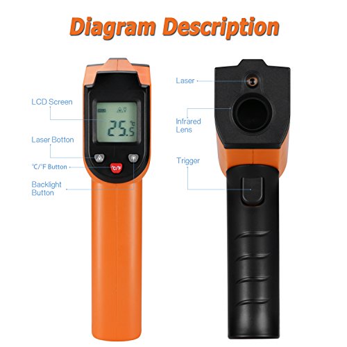 - 【VERSATILE DESIGN】Infrared Technology makes this thermometer handy to use when cooking and barbequing, performing auto maintenance, doing home repairs, and a host of other tasks; Measure all the from -58℉~752℉ / -50℃ ~ 400℃