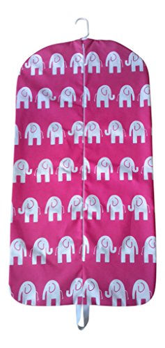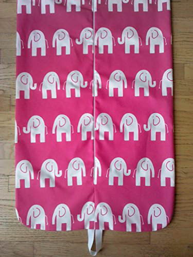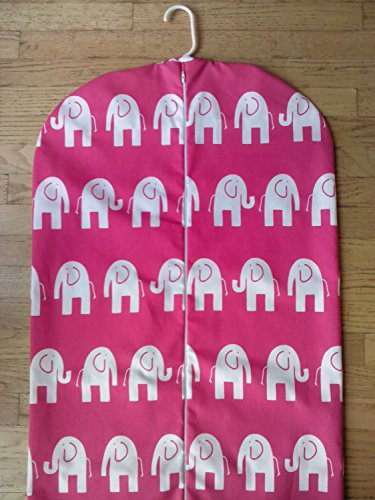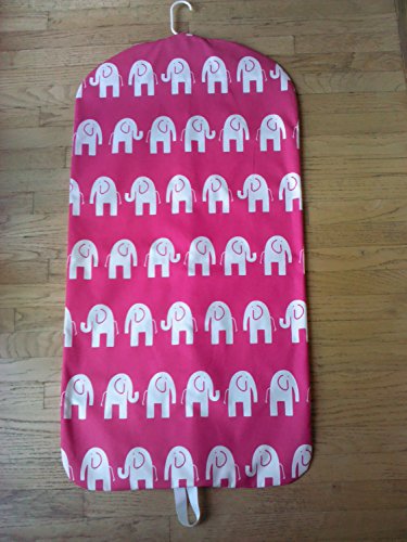 Product Description Ladies or childrens hanging garment bag. Elephants never forget! White elephants on a hot pink background. Made of 100 percent cotton canvas. Zips up the front with a grosgrain loop at the bottom. It will hold 3-5 garments. Cold water wash and hang to dry. Great gift! Great for travel or storage. 0