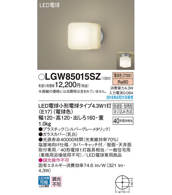 ●光源:LED電球小形電球タイプ4.3W1灯(E17)(電球色)、色温度:2700K、光源寿命40000時間(光束維持率70%)
