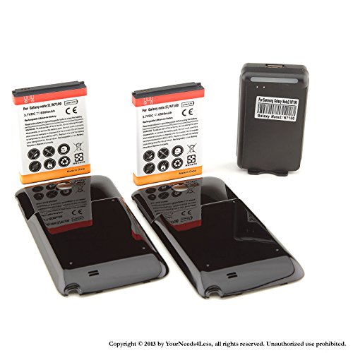 -. Feature : HIGH QUALITY BATTERY CELLS: This YN4L® Samsung Galaxy Note II GT-N7100 battery is manufactured and tested under strict quality control standards. This Replacement Battery will provide you with up to 500 Lifetime Charge Cycles with a high-speed and efficient charge. Keep your phone powered with our high quality, rechargeable Lithium-Ion batteries. An excellent, high-quality replacement for your original battery. Great as a spare battery for long meetings, business trips, and vacations! / COMPATIBLE WITH: The YN4L® 6500mAh Samsung Galaxy Note II GT-N7100 Battery is compatible with the Samsung Galaxy Note II GT-N7100; T-Mobile SGH-T889; SPH-L900; AT&T SGH-i317; Verizon SCH-i605 / REPLACEMENT / SPARE / BACKUP BATTERY: Swap out your old battery with a brand New YN4L® Battery. With an Integrated microchip that prevents overcharging and lengthens battery life! / PACKAGE CONTENTS: 2 X YN4L® Extended Batteries ; 2 X YN4L® Black Extended Battery Back Door Covers ; 1 X ARC® Wall Dock Charger / SATISFACTION GUARANTEED: If you are not 100% satisfied with your order, just let us know. Customer satisfaction is our #1 P.R.Iority. Be sure to buy from DealArmy for authentic items as they are the only authorized seller of YN4L® batteries on Amazon!