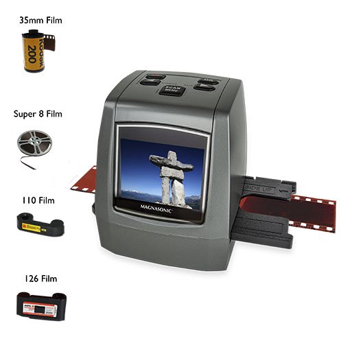 This versatile digital scanner turns your treasured photos into superior high resolution 22 megapixel jpegs. With just one button, you can quickly scan and convert 35mm negatives, 126KPK film, 135 film, 110 film, Super 8 film, slides and negatives into premium quality digital files.