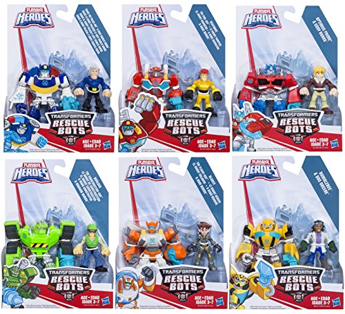 -. Binding : Toy -. Brand : Playskool -. EAN : 0630509377749 -. Feature : There's big fun for little hands in this Rescue Bots 2-pack / Set Includes 6 individually packaged 2-Packs / Set Includes: Optimus Prime and Cody Burns, Fire-Bot and Kade Burns, Chase the Police-Bot and Chief Burns, Bumblebee and Doc Greene, Blades The Copter-Bot & Dani Burns and Boulder The Construction-Bot & Graham Burns / Products do not convert -. IsAdultProduct : 0 -. Label : Hasbro -. Manufacturer : Hasbro -. PackageQuantity : 6 -. ProductGroup : Toy -. ProductTypeName : TOYS_AND_GAMES -. Publisher : Hasbro -. Studio : Hasbro -. Title : Set of 12: Playskool Heroes Transformers Rescue Bots Figures -. UPC : 630509377749