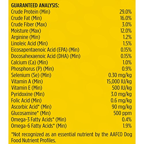 Guaranteed AnalysisCrude Protein (Min)...29.0%, Crude Fat (Min)...16.0%, Crude Fiber (Max)...3.0%, Moisture (Max)...12.0%, Arginine (Min)...1.2%, Linoleic Acid (Min)...1.5%, Eicosapentaenoic Acid (EPA) (Min)...0.15%, Docosahexaenoic Acid (DHA) (Min)...0.15%, Calcium (Ca) (Min)...1.5%, Phosphorus (P) (Min)...0.9%, Selenium (Se) (Min)...0.30mg/kg, Vitamin A (Min)...15,000 IU/kg, Vitamin E (Min)...460 IU/kg, Pyridoxine (Min)...3.0mg/kg, Folic Acid (Min)...0.6mg/kg, Ascorbic Acid* (Min)...90 IU/KG, Glucosamine* (Min)...500 ppm, Omega-3 Fatty Acids* (Min)...0.4%, Omega-6 Fatty Acids* (Min)...1.9%. *Not recognized as an essential nutrient by the AAFCO Dog Food Nutrient Profiles.