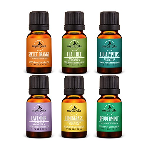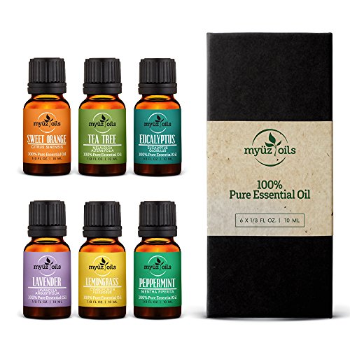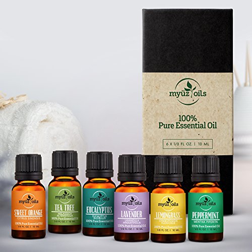 Myüz Oils Aromatherapy Pure Essential Oil Set, Therapeutic Grade - (6) 10mL each (Lavender, Tea Tree, Eucalyptus, Lemongrass, Sweet Orange, Peppermint), 6/10mlL