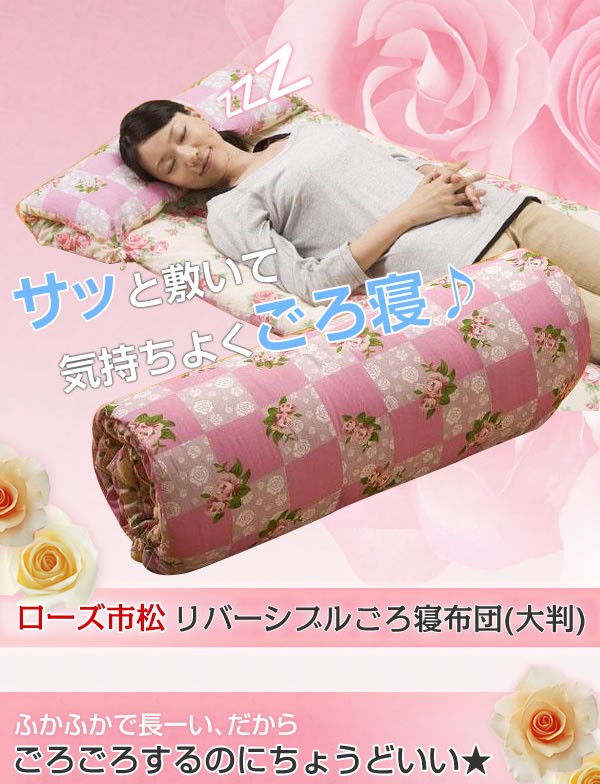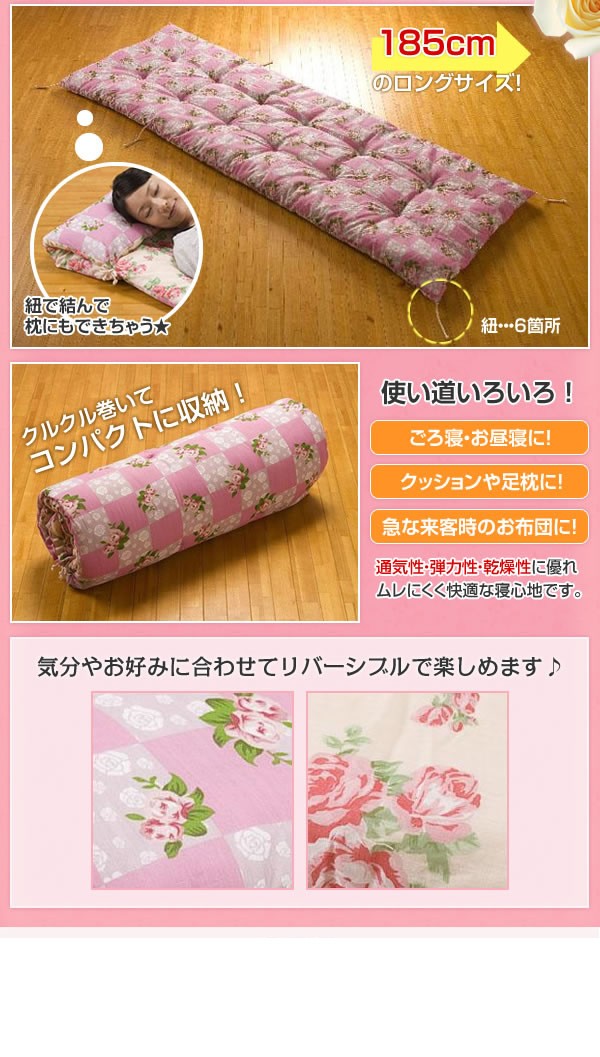 ボリュームたっぷりふかふかごろ寝布団。通気性・弾力性・乾燥性に優れムレにくく快適な寝心地。ごろ寝はもちろん、紐を結んで枕やクッションにもできちゃいます★クルクル巻けば、収納もコンパクト! サイズ/約65×185cm重量/約1150g 素材・材質/表・裏:ポリエステル65%、綿35% 中綿:ポリエステル100% 仕様/手洗い可 製造国/中国 ※サプライヤー直送品【商品名】ローズ市松リバーシブルごろ寝布団(大判)