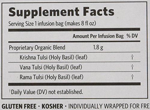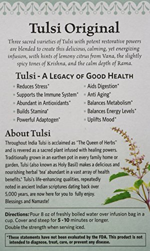 Organic India Tulsi Tea Original are made from three sacred varieties of Tulsi with potent restorative powers are blended to create this delicious, calming, yet energizing tea with hints of lemon and citrus from Vana Tulsi. Tulsi (also known as Holy Basil) makes a delicious and refreshing tea that possesses wonderful health benefits that support the body's natural immune system while relieving the body's negative reaction to stress. All our products promote wellness and are certified organic. Organic India is committed to responsible packaging. The tea package carton is made from 100% recycled paperboard, with a minimum of 30% post-consumer content. Our tea bags are made from unbleached, biodegradable fiber.Feature