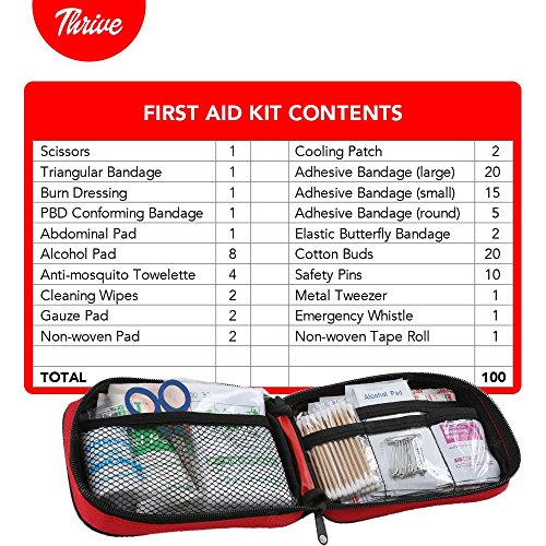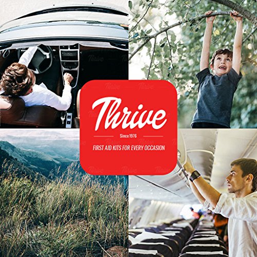 Looking for a complete solution to your First Aid needs? Then Look No Further! The Thrive Brand 100 Piece First Aid Kit is the ideal for emergency kit for nearly any occasion. What Makes the THRIVE First Aid Kit Different? ? DESIGN - Crafted from durable rip-stop nylon and vinyl fabric. Lightweight, compact and yet still holds everything you need for life's unexpected events. ? VALUE - We are confident that you will find that there are more and higher quality contents in our kits than any other on the market! ? QUALITY - Manufactured in a modern sterile FDA registered facility and sold by a FDA registered company that has been doing business for 40 years. ? SATISFACTION GUARANTEE - If for any reason you're not 100% satisfied with our product, simply contact us for a hassle-free full refund. We truly believe in and stand behind our products! ? CONTENTS - Packed with 100 useful and valuable hospital grade medical supplies: Scissors (1) Triangular Bandage (1) Burn Dressing (1) PBD Conforming Bandage (1) Abdominal Pad (1) Alcohol Pad (8) Anti-mosquito Towelette (4) Cleaning Wipes (2) Gauze Pad (2) Non-woven Pad (2) Cooling patch (2) Adhesive Bandage (large) (20) Adhesive Bandage (small) (15) Adhesive Bandage (round) (5) Elastic Butterfly Bandage (2) Cotton Buds (20) Safety Pins (10) Metal Tweezer (1) Emergency Whistle (1) Non-woven Tape Roll (1) 100 TOTAL PIECES View the full line of Thrive Brand First Aid Kits on Amazon. Thrive offers first aid kits for nearly all occasions. 0 |