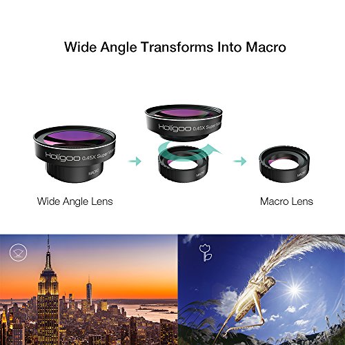 Holigoo Professional 2-in-1 Clip-on Cell Phone Lenses Kit, 0.45X 140°Wide Angle + 15X Macro Cellphone Camera Lens for iPhone 7/ 6s / 6s Plus / 6/5, ipad/ipad air, Samsung, Android Smartphone