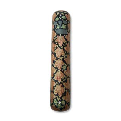 Paper Mache Mezuzah - Black with Large Gold and Red Veined Leaves with Blue 'Shin' Design