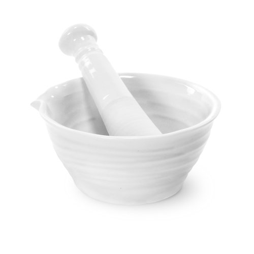 Amazon.com Review Much quieter than using a food processor, this simple, beautiful, and functional mortar and pestle set adds an old-fashioned touch to grinding nuts, herbs, and spices. The sides of the five-inch-diameter bowl are high enough to contain the food being ground, and a rounded lip enables the contents to be poured out. The pestle features a flat top that provides a good pushing surface for the palm of the hand. Shaped with slightly uneven sides, the set exhibits the rustic yet modern look consistent with the rest of the Sophie Conran tableware and bakeware collection. Sophie Conran, an English food writer with her own gourmet pie company, infuses her namesake tableware with a flowing organic nature and tactile expression, as evidenced by the ridges and dipped rims that recall handcrafted pottery. Made of lightweight yet durable porcelain expressly for Portmeirion, the collection comes in glossy white with select pieces available in cool blue celadon and a creamy biscuit color. While the bowl in this set is safe for use in the oven, microwave, freezer, and dishwasher, the thick pestle might be better off staying out of the microwave and freezer. --Ann Bieri