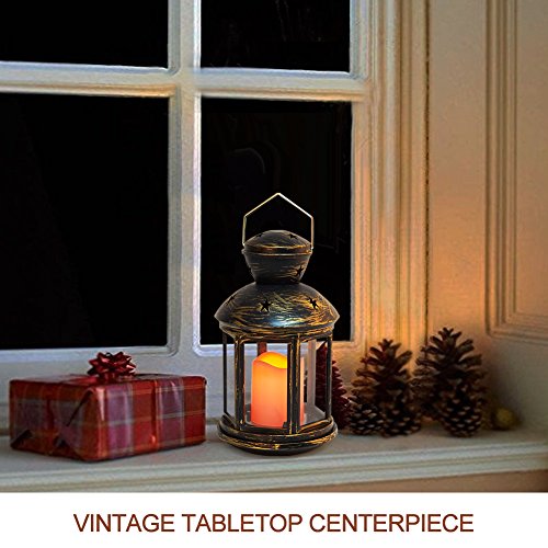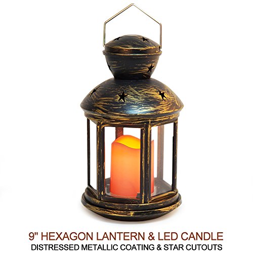 - VINTAGE HEXAGON CANDLE LANTERN WITH FLICKERING LED PILLAR CANDLE - A graceful marriage of beauty & practicality adds a gorgeous touch anywhere - 9" tall HEXAGON lantern with star cutouts, finished in DISTRESSED BRONZE METALLIC COATING creates a look of a cherished heirloom - A big LED bisque pillar candle has the look of a real wax candle with wavy edge & soft glow flicker, captivating and safe - Eye-catching prop for tables, bars, patios, porches; fabulous INDOOR OUTDOOR decor DAY & NIGHT.