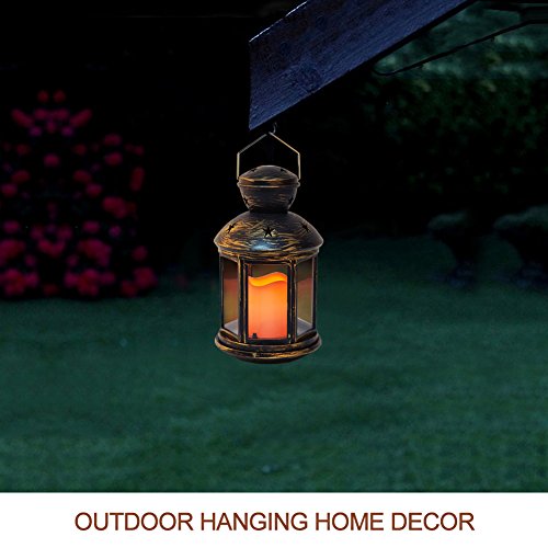 - HIGH QUALITY & VERSATILE - Four clear glass panes room the big pillar candle, with metallic bronze coating ABS frames, ceiling, floor, and cross grids of the lantern - Sturdy, corrosion resistant, weather resistant - Serves as lighting and decoration for yard, wall, pathway, driveway, shelf, table, bars, photo booths, patio, porch, etc. - A HANGING RING for easy hanging, or sits on a flat surface - Wireless & Lightweight (0.9lbs), convenient to carry around.