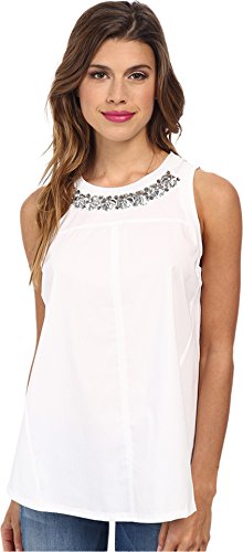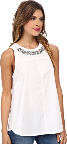 A jersey Rebecca Taylor top with a tonal poplin panel. A sequined neckline dresses up the simple silhouette. Side slits. Sleeveless.