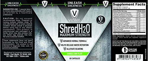 -. Binding : Health and Beauty -. Brand : VIZINX -. EAN : 0738964748583 -. Feature : If your desire a natural herbal supplement that will support healthy water balance then we welcome you to try ShredH2O and promise that you will not be disappointed. / 100% Money Back Guarantee, we are always excited to meet and exceed our customer's expectations. / Supports Healthy Potassium Levels & Water Balance / Alleviate Bloating Naturally / Vizinx ShredH20 is manufactured in the USA by a Registered & Inspected FDA Facility. -. IsAdultProduct : 0 -. IsAutographed : 0 -. IsMemorabilia : 0 -. Label : Vizinx -. LegalDisclaimer : This statement has not been evaluated by the Food and Drug Administration. This product is not intended to diagnose, treat, cure or prevent any disease. -. Manufacturer : Vizinx -. MPN : 4858 -. PackageQuantity : 1 -. PartNumber : 4858 -. ProductGroup : Health and Beauty -. ProductTypeName : HEALTH_PERSONAL_CARE -. Publisher : Vizinx -. Studio : Vizinx -. Title : VIZINX Shred H2O Herbal Diuretic - #1 Formula with Dandelion, Green Tea, Cranberry, Apple Cider Vinegar, Buchu, Juniper, Watermelon & More. Supports Healthy Potassium Levels & Water Balance 60 caps. -. UPC : 738964748583