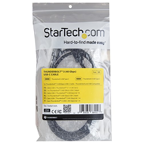 Studio : STARTECH.COM Publisher : STARTECH.COM Binding : Personal Computers Product Description " This Thunderbolt™ 3 (40Gbps) cable lets you connect to any Thunderbolt 3 (USB-C™) port to deliver video and data to your Thunderbolt and USB devices. Plus, the cable can provide power for charging your devices. Faster data transfers when connected to Thunderbolt devices This cable supports data transfer rates of 40Gbps when connected to a Thunderbolt 3 device, so you can transfer photo and video files at four times the speed of a USB 3.1 Gen 2 (10Gbps) cable. For example, you can transfer a 4K movie in seconds. USB-C compatible You can also use the Thunderbolt 3 cable to charge and sync your USB 2.0, USB-C mobile devices. Full 5K video or dual 4K video The cable supports up to 5K 60Hz video for astonishing resolution, contrast, and color depth with a Thunderbolt monitor. It can also be used with a Thunderbolt 3 dock to drive dual 4K displays. This cable does not support native DisplayPort 1.2. You cannot connect your Thunderbolt 3 laptop directly to a DisplayPort monitor using this Thunderbolt 3 cable. Versatile power delivery This Thunderbolt 3 cable delivers up to 60W of power for charging a laptop. It lets you keep your Thunderbolt 3 devices powered without having to carry around an additional power supply. Thunderbolt networking The cable gives you an easy way to bridge multiple Thunderbolt 3 USB-C enabled laptops for peer-to-peer 10GbE networking. It’s perfect for setting up small workgroups and sharing peripherals such as printers and storage. You can also connect two Thunderbolt 3 laptops together, for easy PC migrations. The TBLT3MM1MA is backed by a 2-year warranty. " 0 |