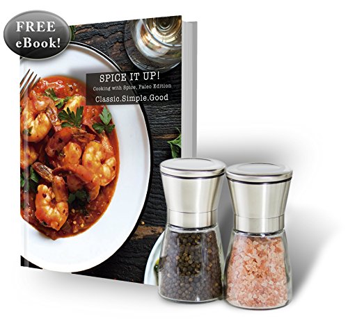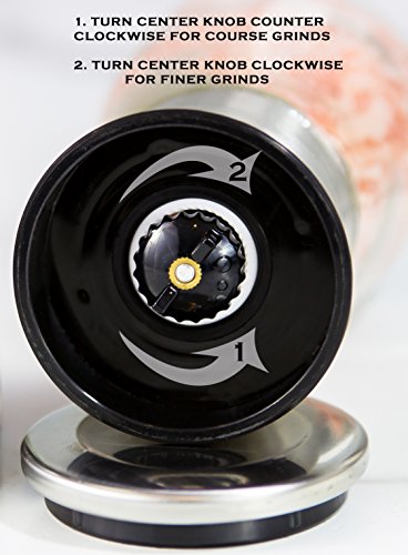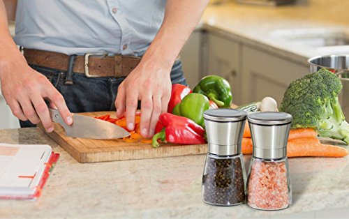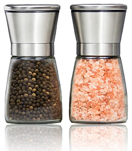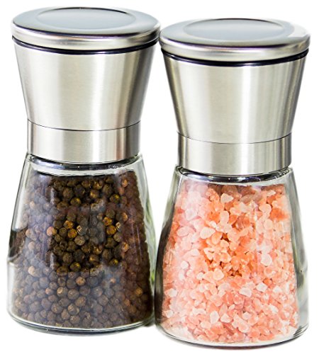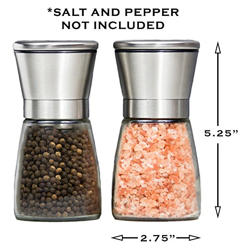 Salt and Pepper Shakers - Salt & Pepper Grinder Set - Spice Mill - Glass Body Brushed Stainless Steel
